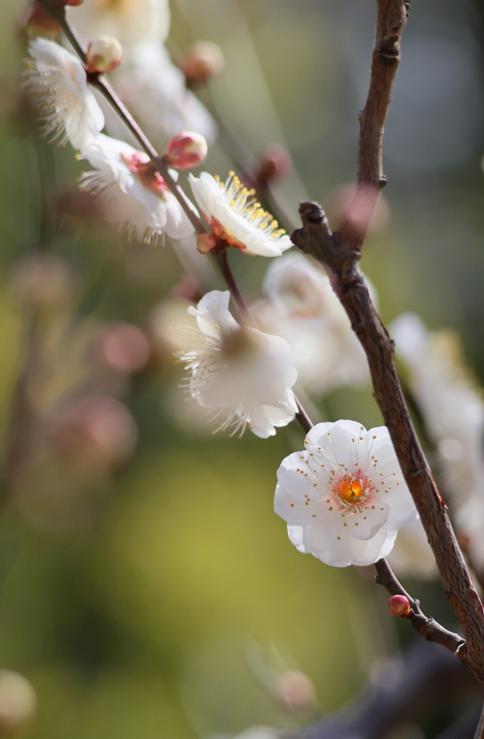 梅のポートレートを狙うには白梅が好きである。白の清楚さがたまらない。梅の表情は背景の選択によって大きく影響を受ける。この写真では背景の緑いろが白を浮きたたせた。大田区の西嶺公園は、小さな梅園だが、光の状態で梅が綺麗に撮れる舞台である。