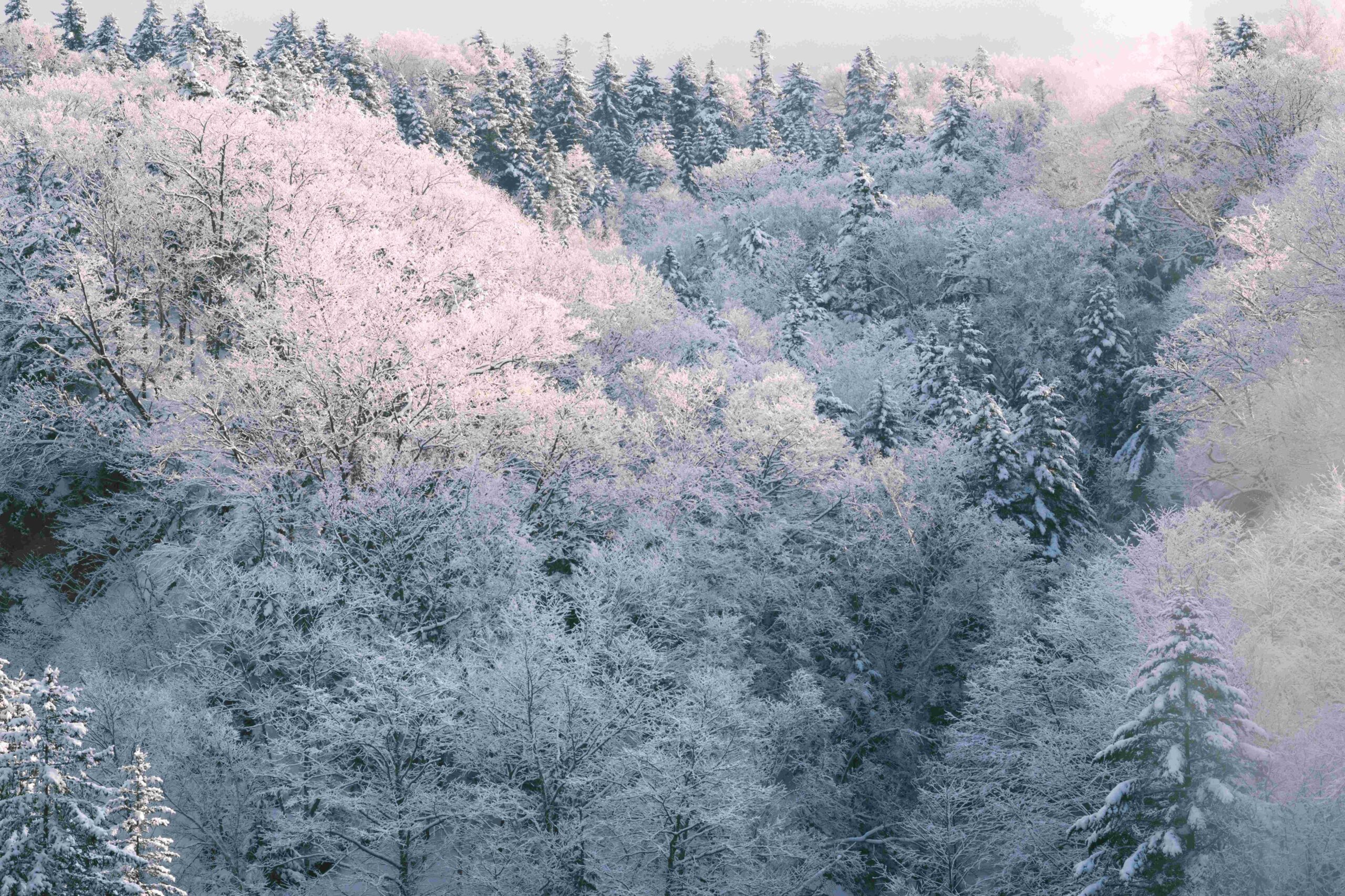 美瑛の青ひげの瀧の撮影をしたが、前夜に降雪した新雪が樹木に残り日の出の光が差し込み、美しかった。プラチナの輝きである。滝を切り捨てて樹木だけの画像にした。